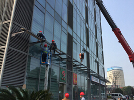 綠地鉑驪酒店幕墻玻璃更換施工現場照。