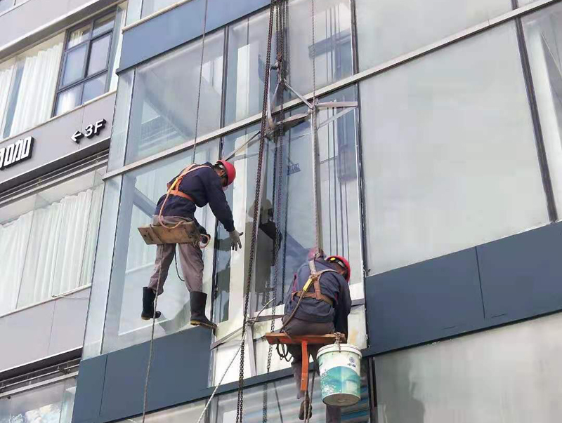 小田園電梯外幕墻玻璃更換施工現場照。